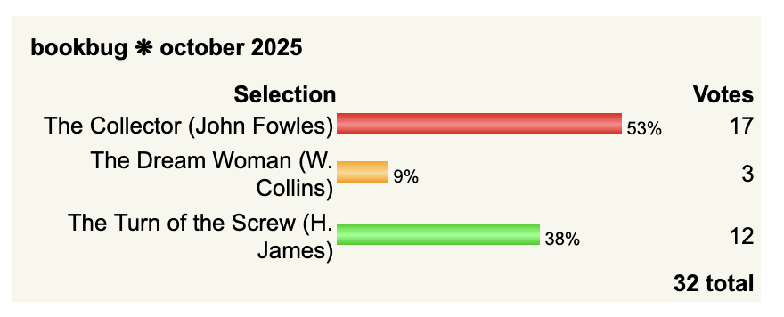 Hello, October! Our choice for this month is The Collector, by John Fowles. Thank you everyone for voting and happy readings!